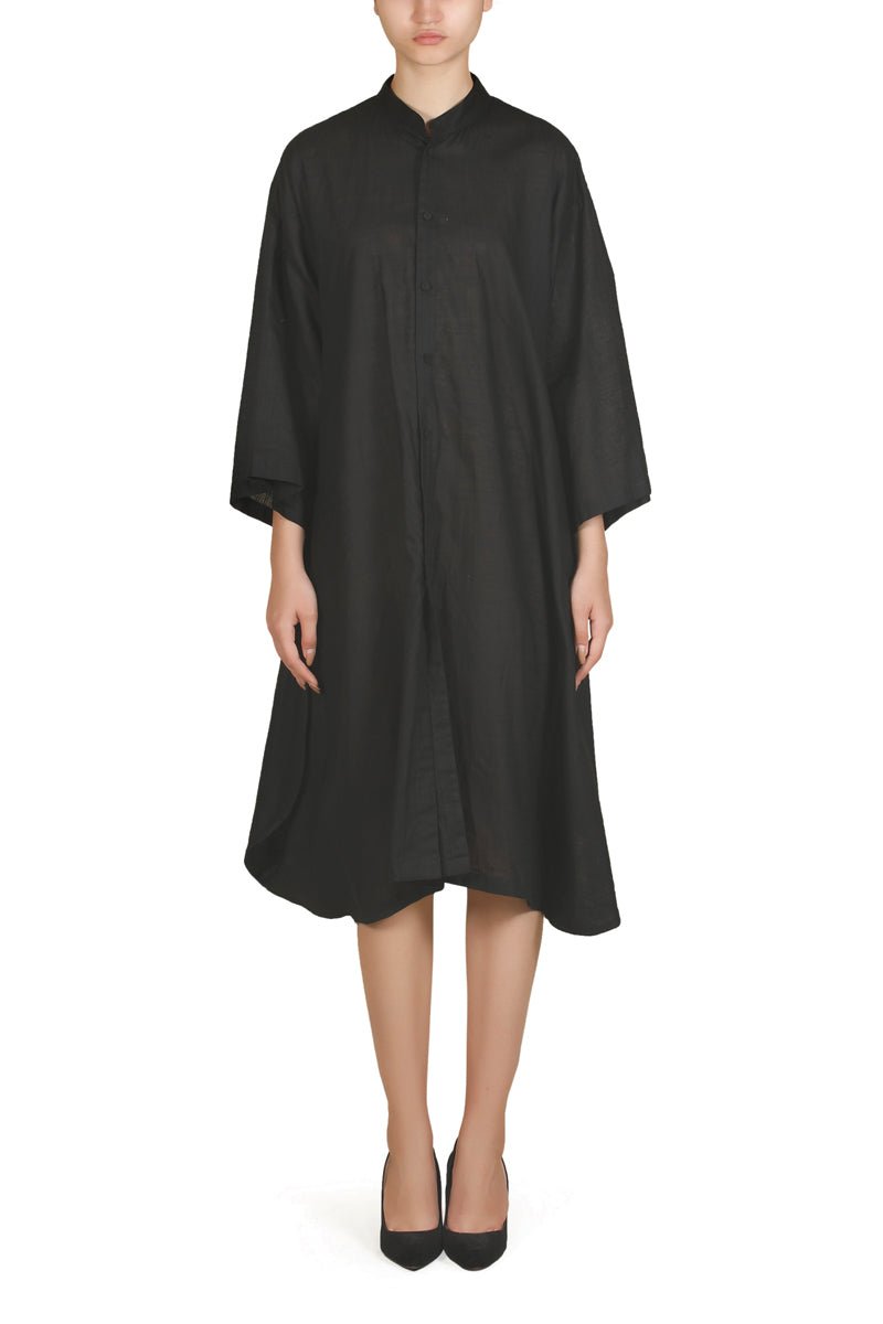 Featuring a Black mandarin collared front button-down Dress.Color: BlackFabric: Linen CottonCare Instructions: Dry Clean Only.
