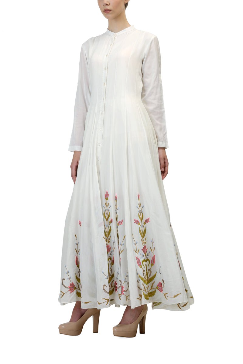 Featuring an ivory front-opening mandarin collar paneled cotton dress embroidered in vibrant silk yarn.Color: IvoryFabric: Cotton Care Instructions: Dry Clean Only.