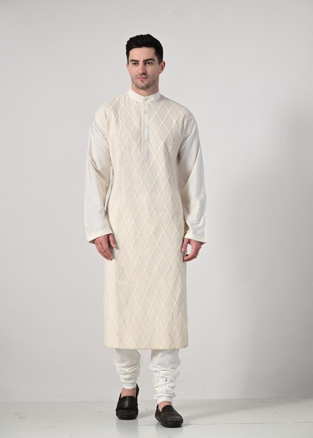 Refined and timeless, this ivory kurta features an intricate diamond-patterned embroidery on the front panel. Crafted from high-quality fabric with a sleek mandarin collar and buttoned placket, it's paired with a classic white ...