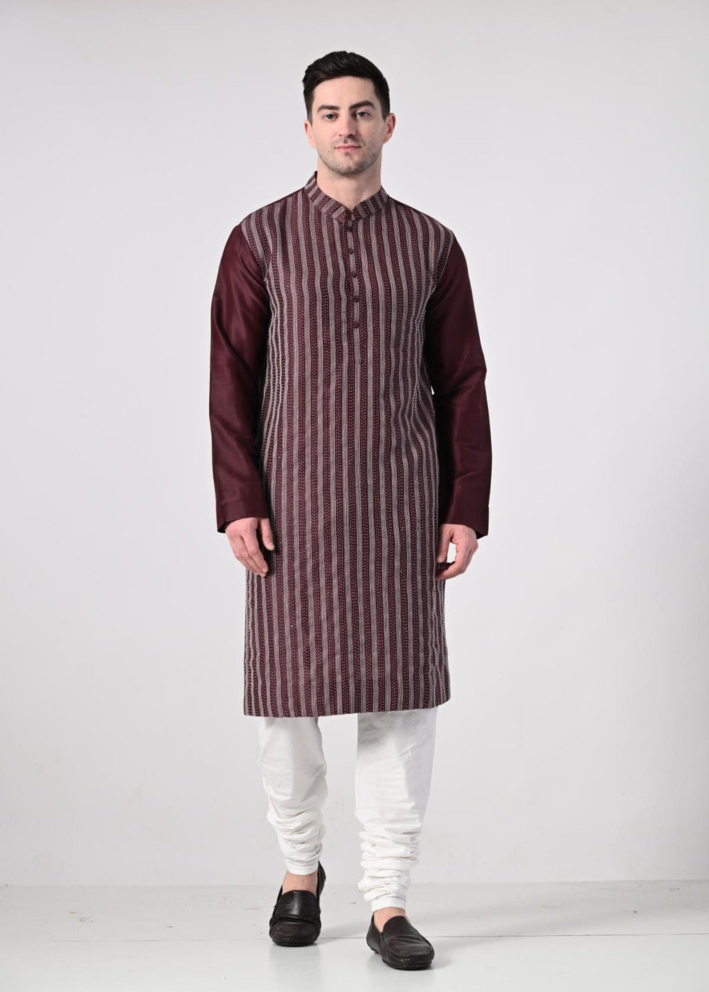 maroon kurta featuring an intricately woven vertical striped pattern on the front. Paired with solid maroon sleeves and a mandarin collar, this design brings a bold yet traditional charm. Comes with a white churidar, making it ...