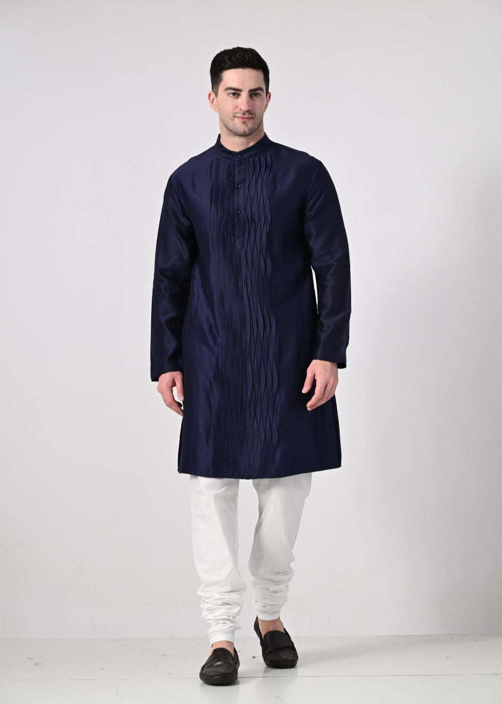 Make a bold style statement with this elegant navy blue kurta featuring intricate front panel detailing. Tailored from a glossy fabric for a premium look, it includes a mandarin collar and button placket. Paired with a white ch...