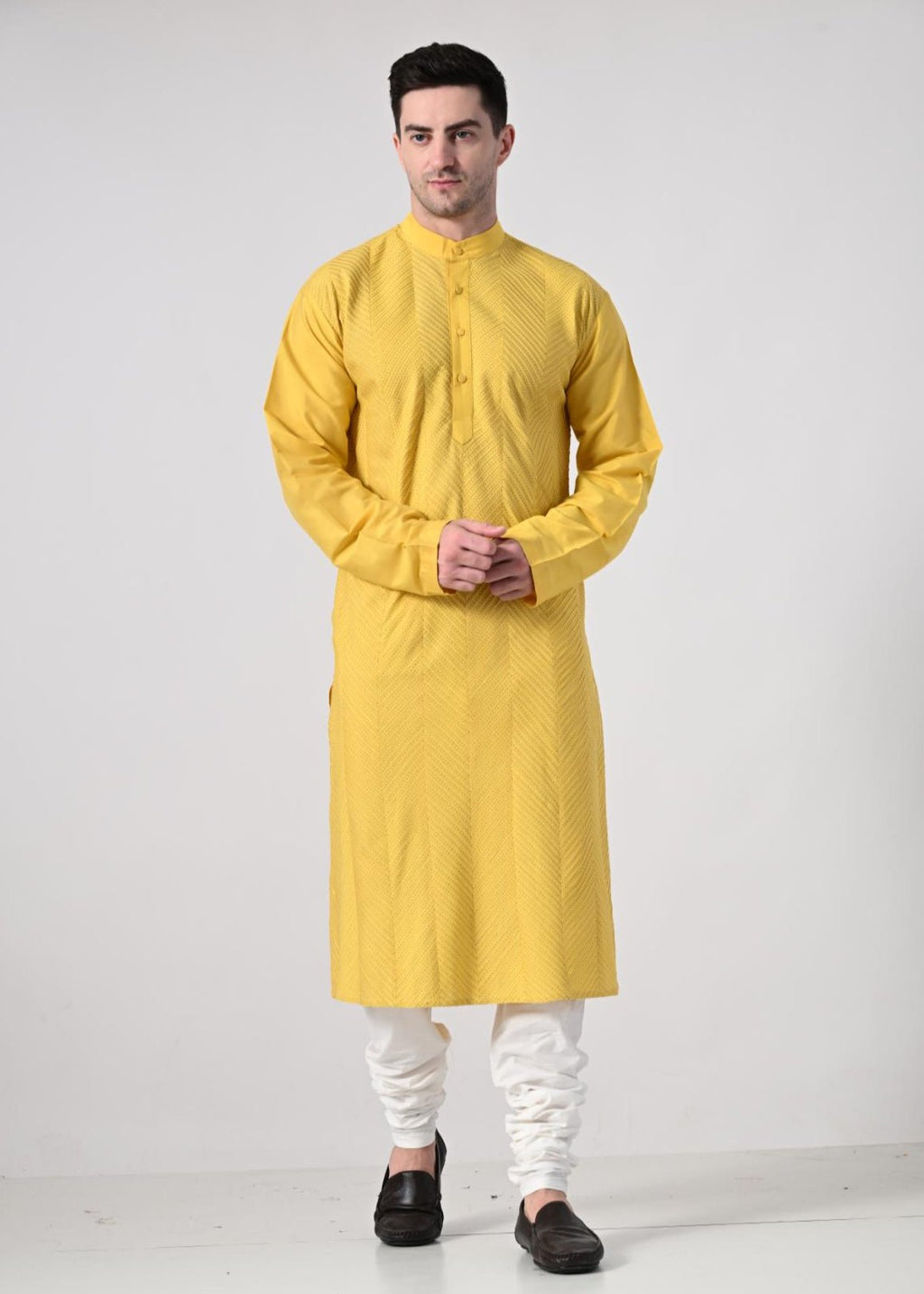 this vibrant yellow kurta, crafted from premium fabric for all-day comfort. Featuring a classic mandarin collar, button placket, and full sleeves, it's paired with a white churidar for a timeless festive look. Ideal for wedding...