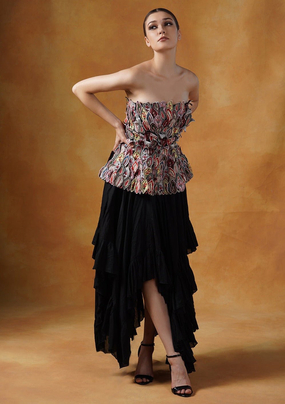 The model is wearing a Multicolor embroidery corset appliqué work with black tier skirt .
