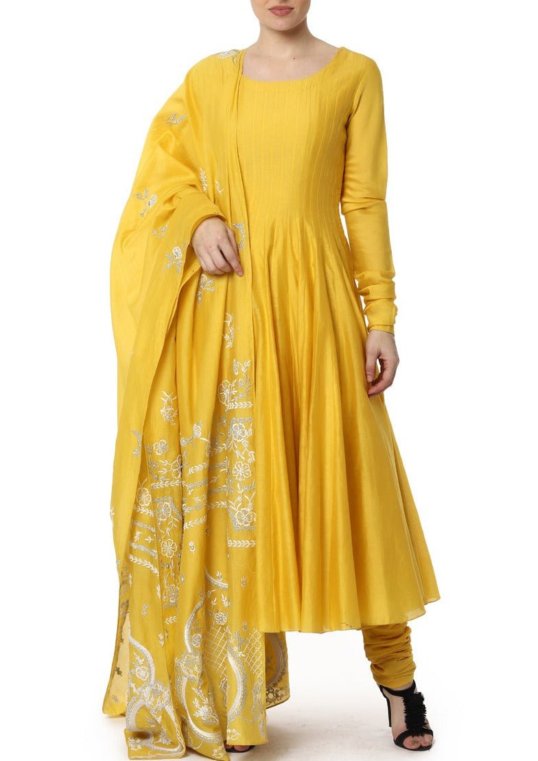 Mustard rib chanderi full sleeve anarkali with silk thread embroidered rib chanderi dupatta