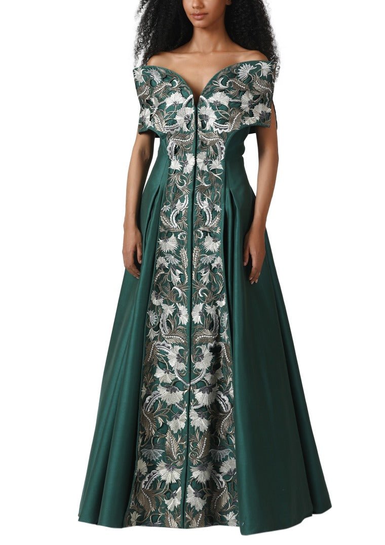 Silk thread floral embroidery off shoulder gown fitted flap at yoke