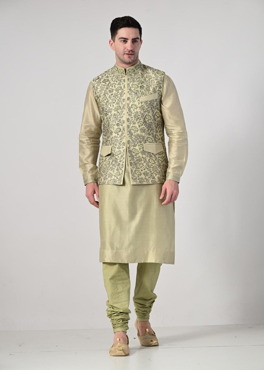 Elevate your ethnic wardrobe with this pastel kurta churidar set, featuring a beautifully embroidered Nehru jacket in floral patterns. Ideal for weddings, festive gatherings, and traditional events, this ensemble blends timeles...