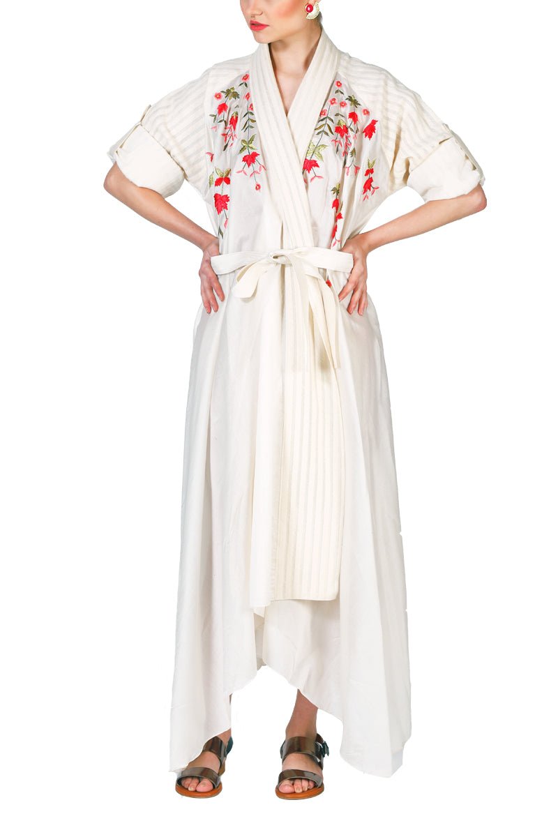 Featuring an ivory raglan sleeves, robe style front tie-up asymmetirc hemline dress with embroidery of silk yarn & zari.Color: IvoryFabric: Cotton SilkCare Instructions: Dry Clean Only.