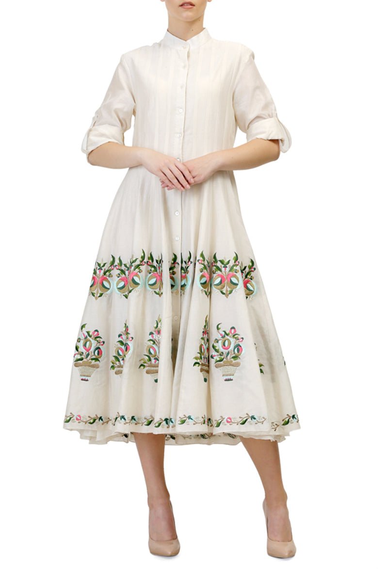 Featuring an ivory roll-up sleeves embroidered cotton silk flare dress.Color: IvoryFabric: Cotton SilkCare Instructions: Dry Clean Only.