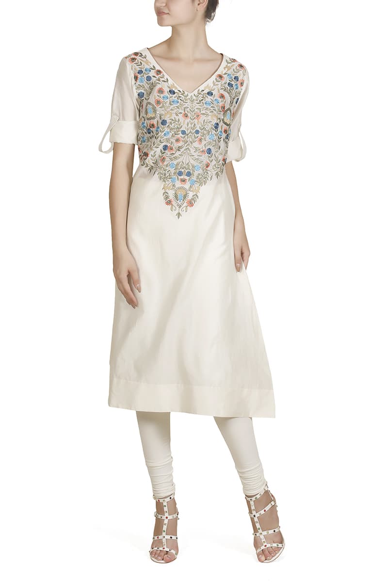 Ivory calf-length roll-up sleeves cotton silk kurta with embroidered floral motifs of silk yarn.