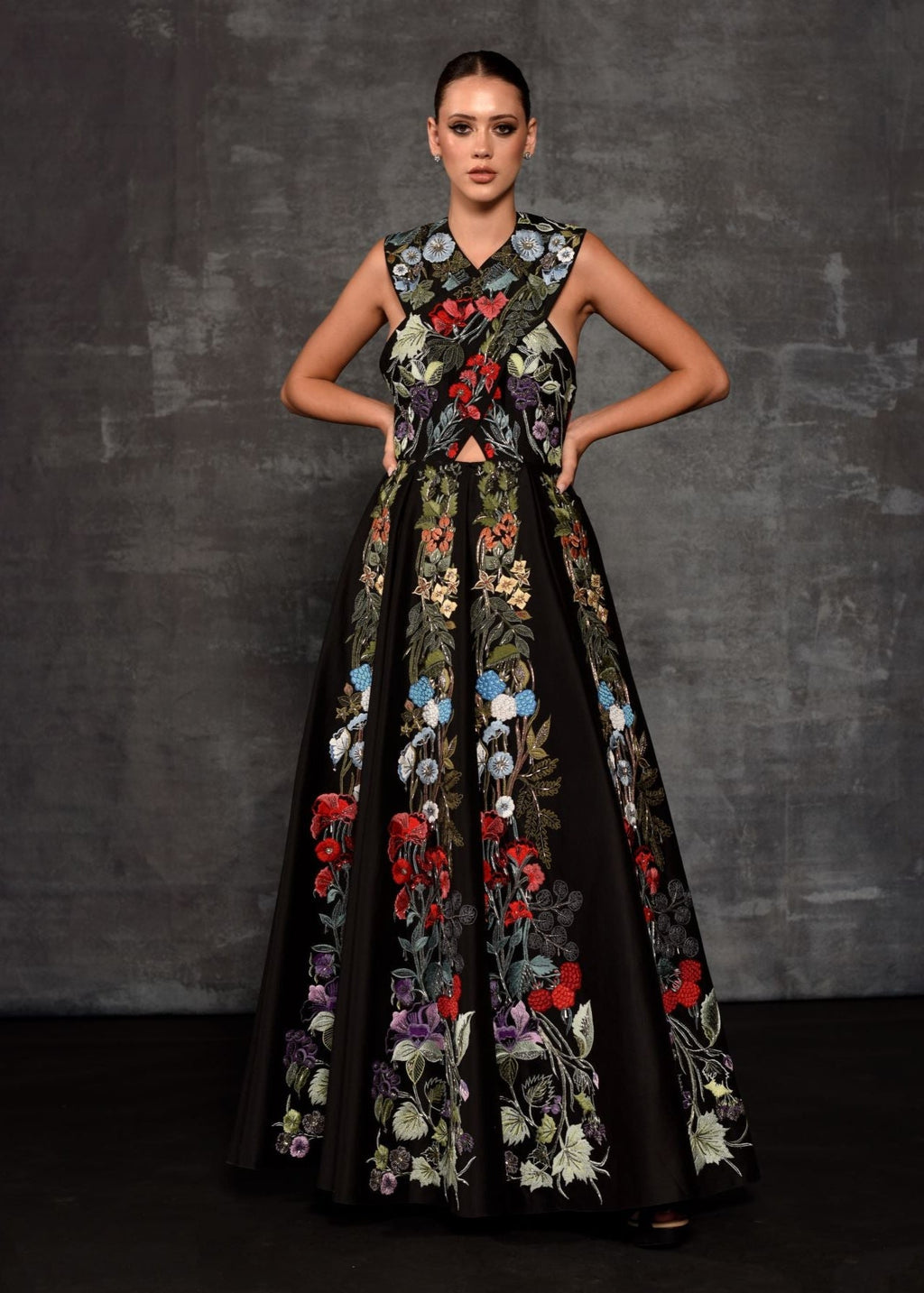 This exquisite black gown is a masterpiece of intricate artistry, featuring a captivating array of multi-colored floral and botanical embroidery that cascades elegantly from the bodice to the sweeping hem.