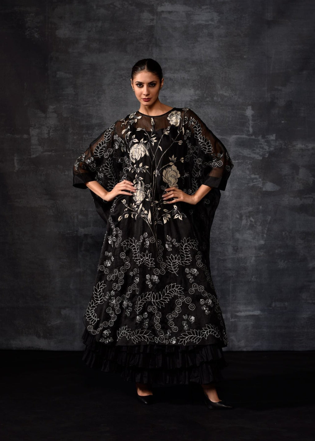 black organza fabric ensemble features a flowing, sheer kaftan adorned with exquisite white and silver floral and botanical embroidery that cascades elegantly down the fabric. Along with inner dress