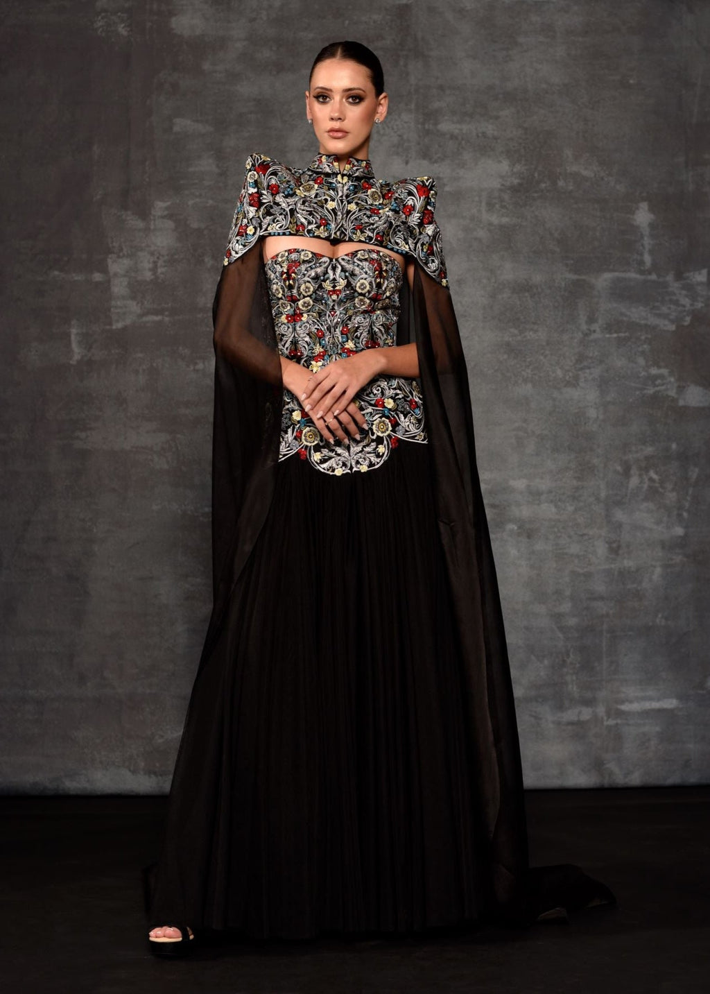 this striking black ensemble features a beautifully fitted bodice intricately adorned with rich, multi-colored floral and scroll embroidery