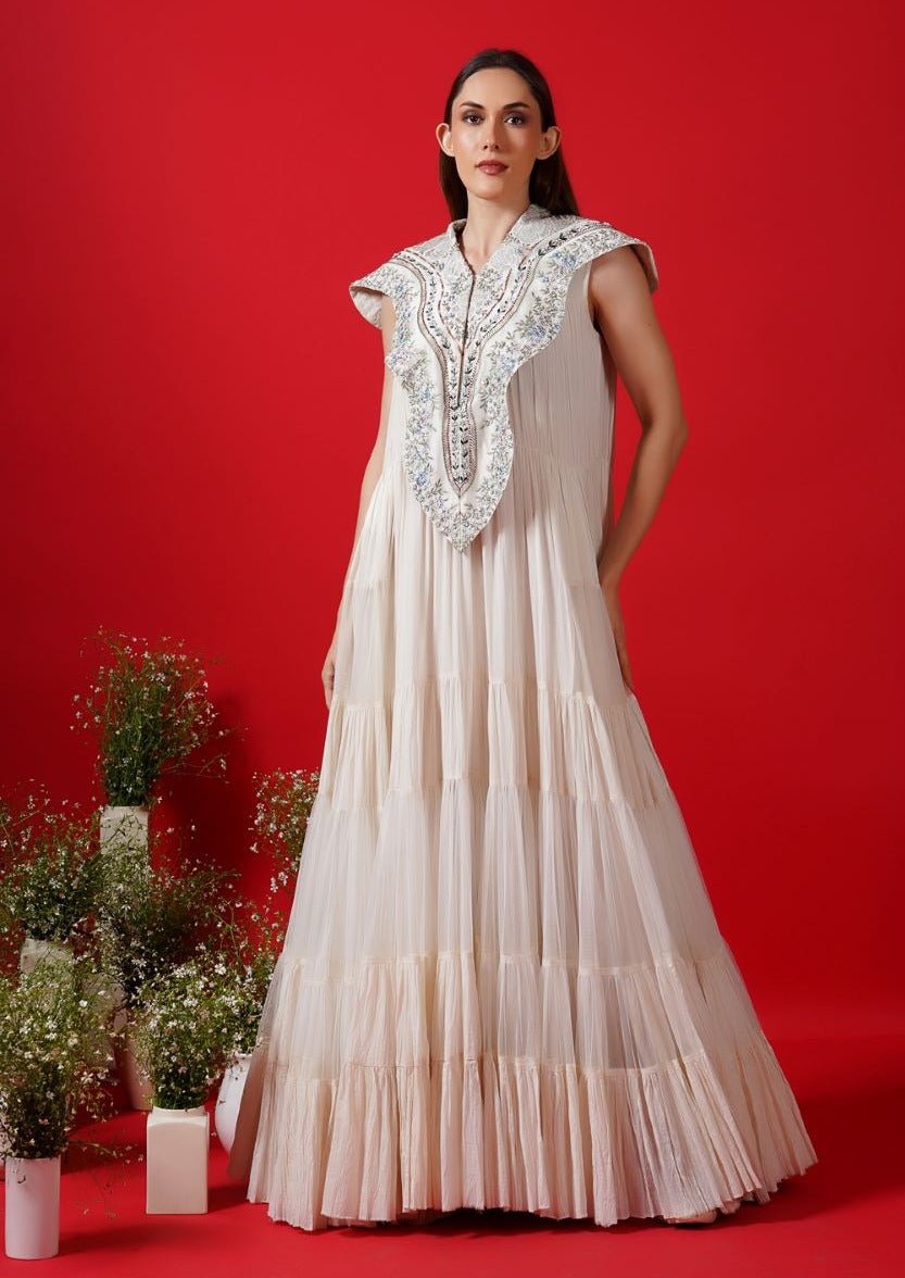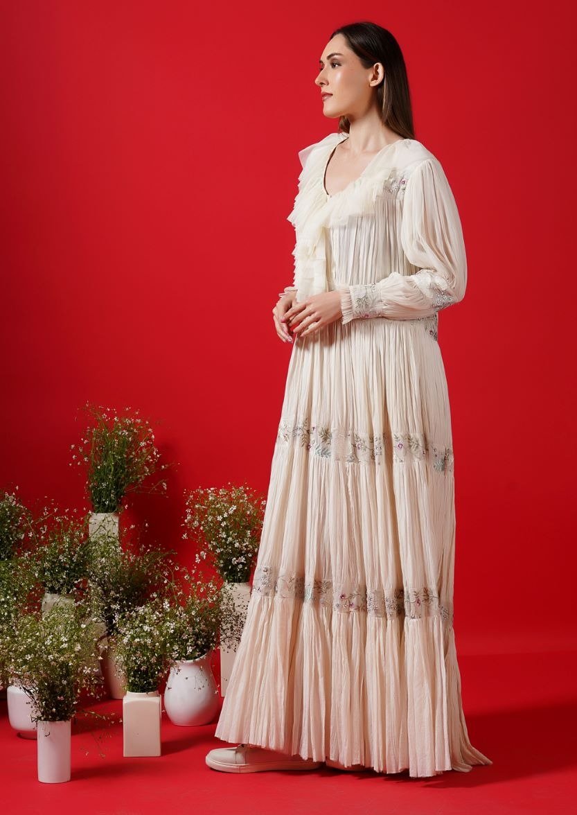 Ivory tiered embroidered kaftan gown.Color: IvoryFabric: Chanderi & OrganzaCare Instructions: Dry Clean Only.
