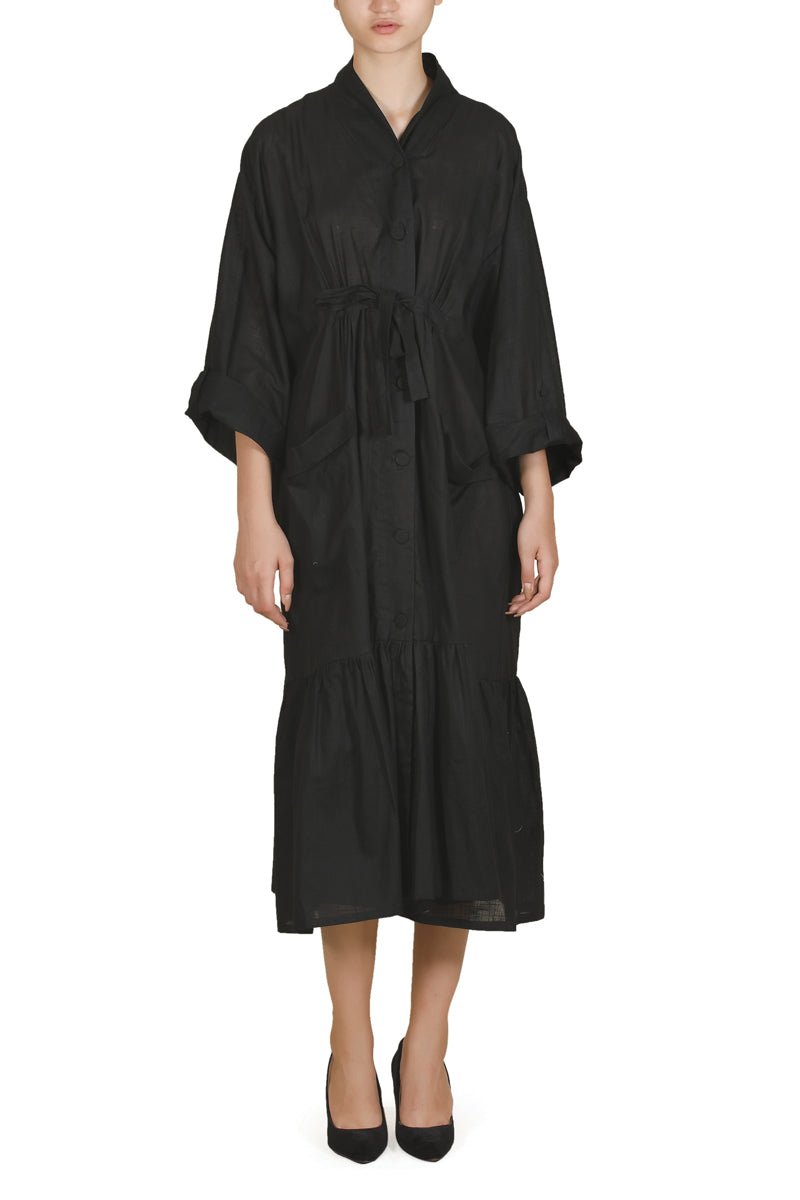 Featuring a black robe style front tie-up dress with pockets & gathered hemline detailing.Color: BlackFabric: Linen CottonCare Instructions: Dry Clean Only.