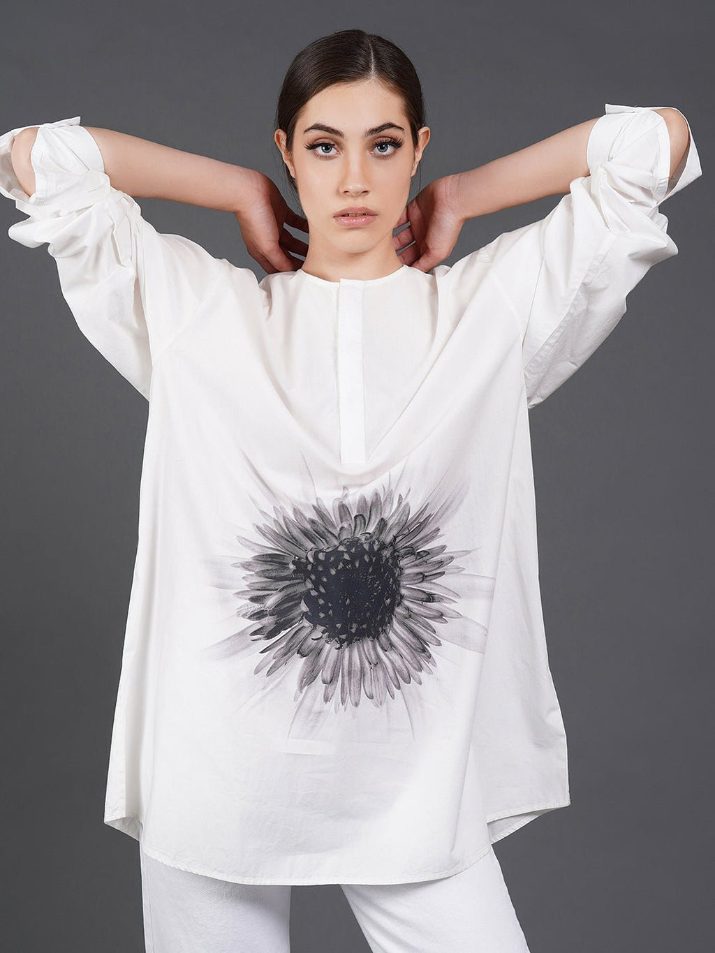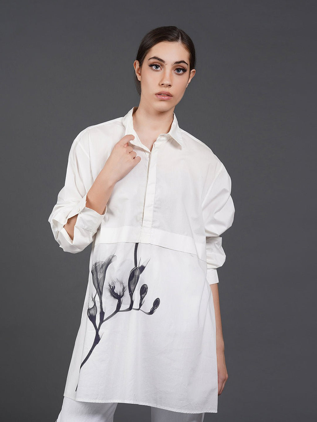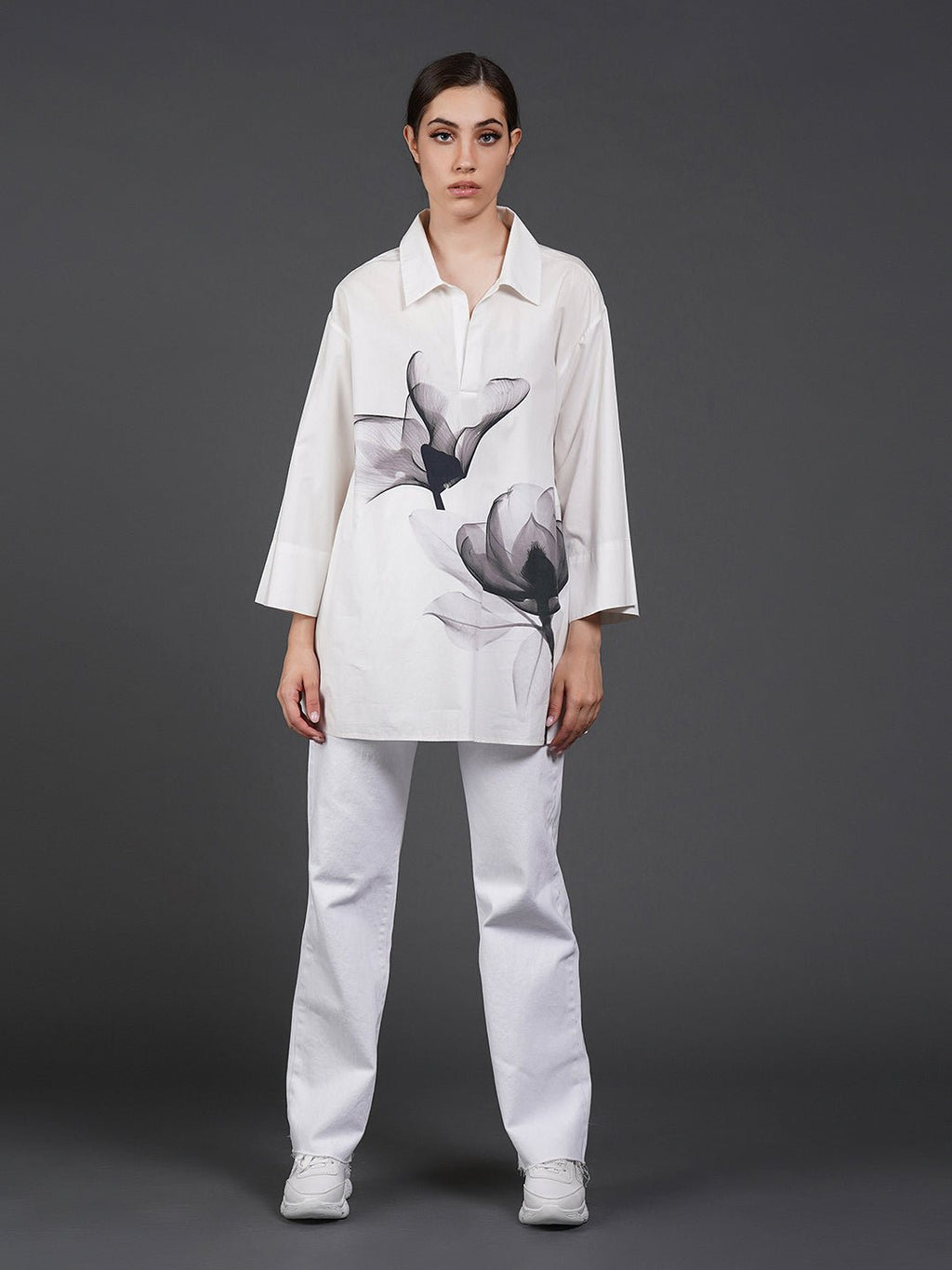White, stylish, lose-fit, cotton shirt with digital print on it