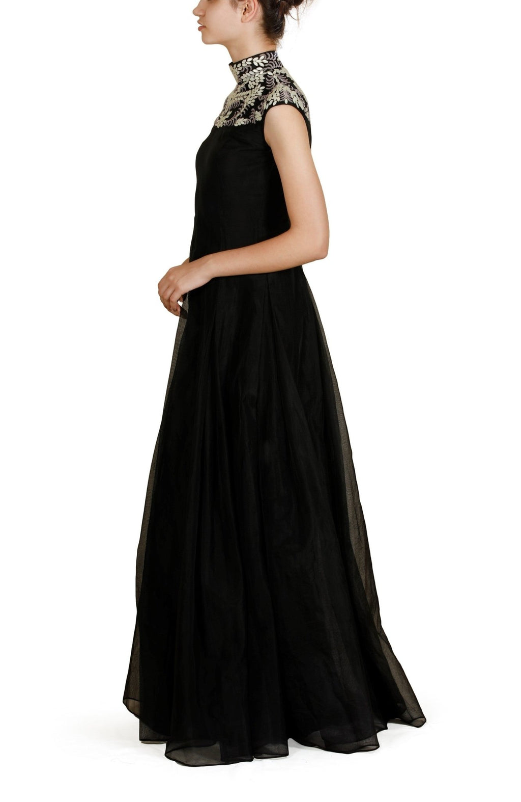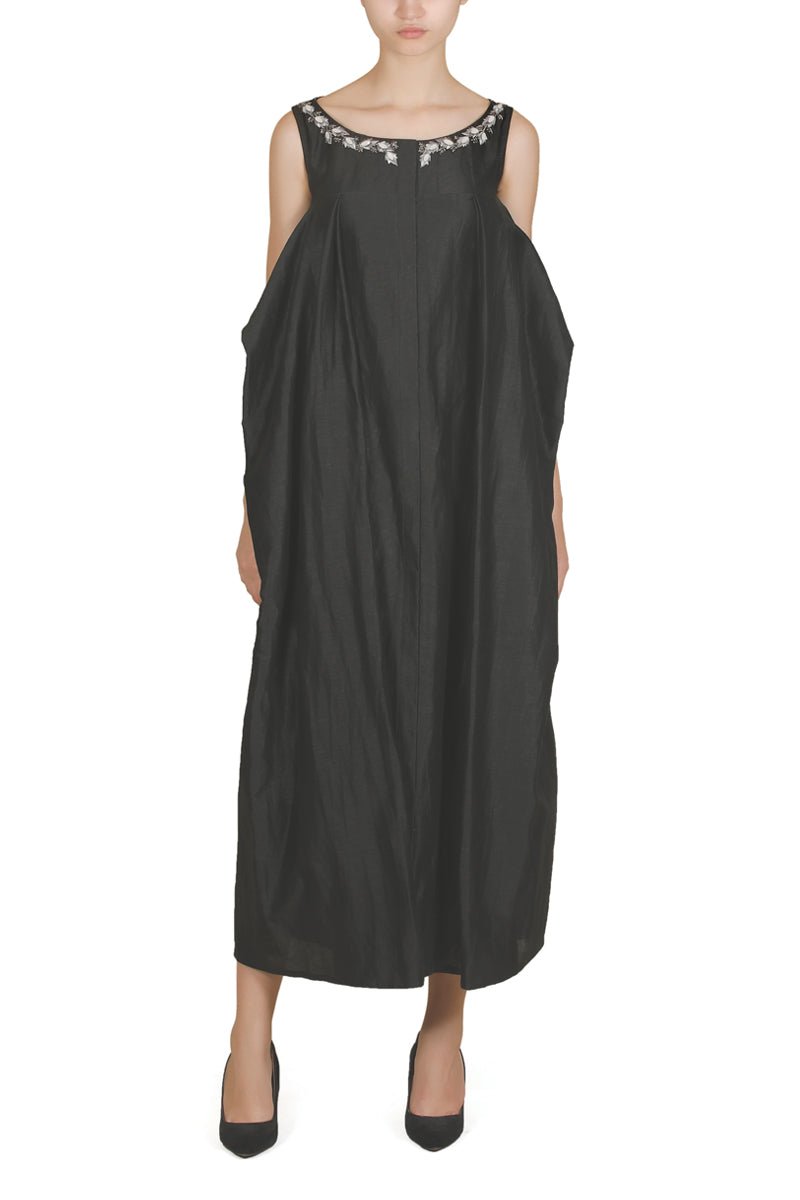 Black front-opening yoke embroidered & pleat detailed chanderi dress.Color: BlackFabric: ChanderiCare Instructions: Dry Clean Only.
