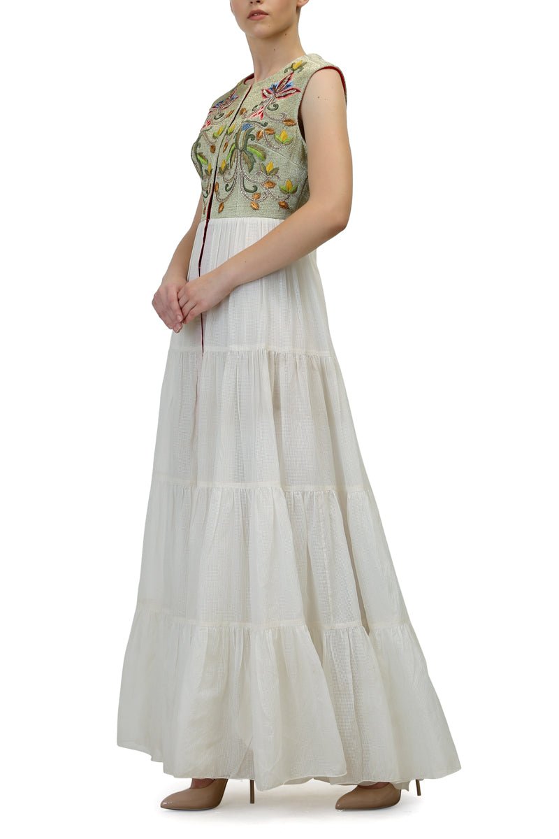 Featuring an ivory yoke embroidered tiered cotton silk dress.Color: IvoryFabric: Cotton SilkCare Instructions: Dry Clean Only.