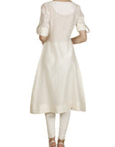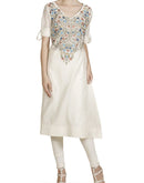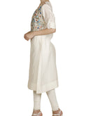 Ivory calf-length roll-up sleeves cotton silk kurta with embroidered floral motifs of silk yarn.