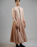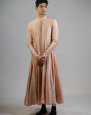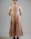 A flowing cotton silk kurta in a soft blush tone, featuring a paneled construction that creates graceful movement and volume. The minimal embroidery along the placket adds a touch of understated detail to its clean silhouette