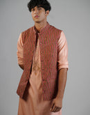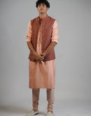 A cotton silk kurta set paired with a richly textured waistcoat, featuring intricate brocade-inspired print that adds depth and character. The dark peach color is balanced by clean tailoring for a sharp, composed look.
