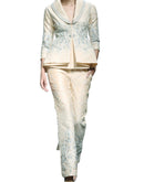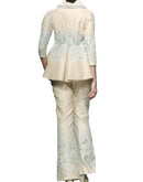 Apricot yellow embroidered peplum chanderi jacket & embroidered flared chanderi pants.