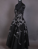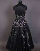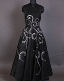 Featured here is a black chanderi A-line dress with a tube top pattern and box pleats on the skirt, showcasing beautiful silver zari embroidery. Adding fun to the garment is a stylised cape that makes for the neck and sleeves.