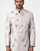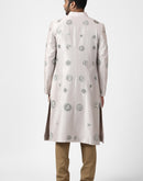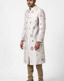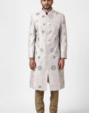 A pristine cotton silk sherwani in an soft ivory tone, adorned with spaced medallion embroidery that adds a sense of balance and refinement. The smooth texture and subtle sheen enhance its clean, structured form.