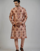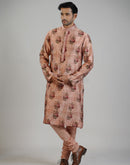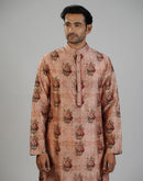 A soft peach cotton silk kurta adorned with intricate floral Print, offering a rich interplay of texture and detail. The gentle sheen of the fabric enhances its fluid drape and refined finish
