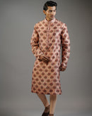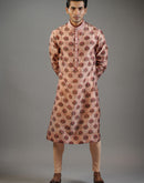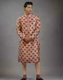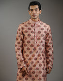 A refined cotton silk kurta in a muted rose tone, detailed with repeating buta motifs that lend a sense of rhythm and texture. The smooth finish and tailored silhouette create a clean, contemporary look