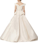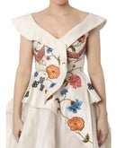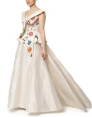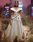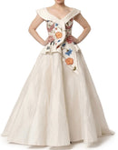 Ivory cotton silk corset gown with a small trail and stylized neckline. The yoke is embroidered in colorful floral motifs.