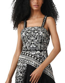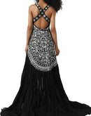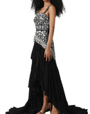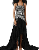 Black asymmetric, high low hem fit & flare cotton silk gown with silver zardozi embroidery.It has strappy sleeves that extend to the back.