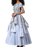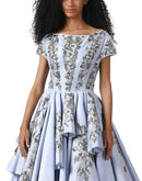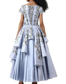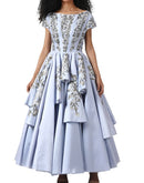 Powder blue ankle-length, cotton silk gown with boat neckline fit & flare. The skirt of the gown has a voluminous flare. Asymmetric pleated flaps are given around the waist that fall down the skirt. The embroidery is showcased on yoke and pleats in zari yarn.