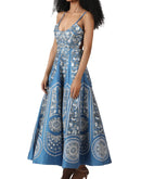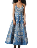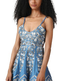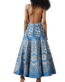 Blue short-length front stripe & backless neckline fit & flare cotton silk gown grey & silver embroidery.