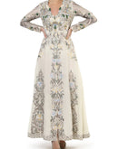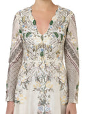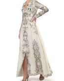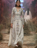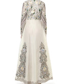 Ivory front-opening linen silk gown embroidered floral motifs of silk & zari yarn.