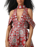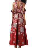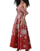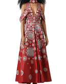 Red short-length halter neckline fit & flare cotton silk gown adorned with silver & grey bright zardoji embroidery.