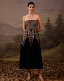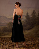 Chic black strapless dress with a richly embroidered bodice and a flowing midi skirt. An ideal choice for making a sophisticated colorful embroidery Fabric: Velvet fabric Embroidery details: Silk thread...