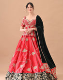A striking lehenga set that blends festive vibrance with heirloom craftsmanship, featuring rich silks layered with ornate hand embroidery. Designed for grand celebrations, this ensemble balances bold colour with refined detailing for a timeless statement.