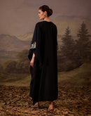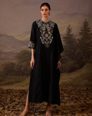 A comfortable yet elegant black caftan-style dress featuring vibrant, intricate embroidery around the neckline and on the relaxed sleeves