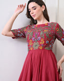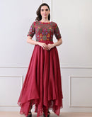 Crafted from a luminous shimmer fabric and lined with soft cotton, this Anarkali radiates heritage charm with a touch of modern sophistication. The bodice is adorned with intricate floral motifs,...