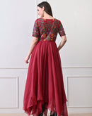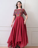 Crafted from a luminous shimmer fabric and lined with soft cotton, this Anarkali radiates heritage charm with a touch of modern sophistication. The bodice is adorned with intricate floral motifs, meticulously hand-embroidered in fine silk threads and enriched with opulent zardozi work. The fluid drape and subtle sheen of the fabric lend a graceful, timeless allure.