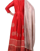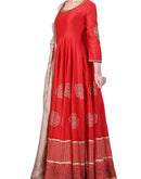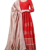Scarlet Red floor-length block printed Cotton Silk Kurta paired with a Beige block printed Cotton Silk dupatta.