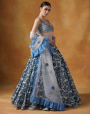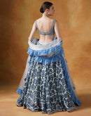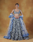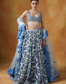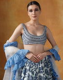 A printed lehenga set in shades of blue and Ivory with intricately embroidered blouse and organza Dupatta with cotton frill border