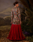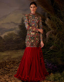 Turn heads with this exquisite high-neck mini dress featuring intricate multicolored floral embroidery. The fitted silhouette, sheer long sleeves along with crushed cotton red skirt Fabric: Net & cotton Embroidery...