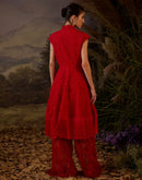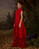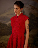 A red chiffon textured short jacket dress calf length showcasing intricate silk thread embroidery