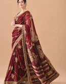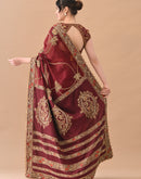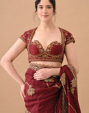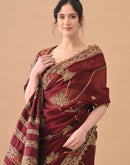 A timeless sari that celebrates heritage craftsmanship through refined detailing and luxurious textures. Crafted in a blend of organza, lurex, and raw silk, the drape features delicate zari and thread embroidery arranged in ornate floral and paisley motifs. The luminous lurex lends a subtle sheen, while the raw silk border adds structure and depth to the silhouette. Finished with a richly embroidered pallu and intricately detailed edging, this sari balances elegance with grandeur. Ideal for weddings, festive evenings, and ceremonial occasions where tradition meets modern refinement.